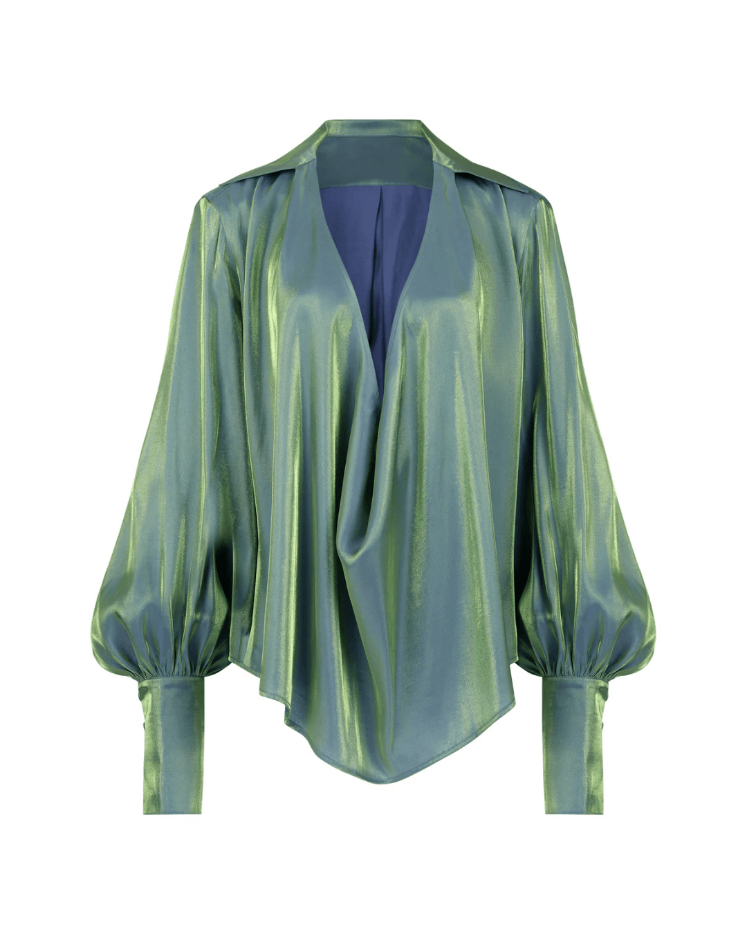 Speaking of fun and expressive tops, this top is easily a shining star in any wardrobe. I absolutely adore this piece because it is truly iridescent, catching the light in the most enchanting way and shifting colours with every movement — it’s like wearing pure magic! The elegant plunge neckline adds that touch of unexpected sophistication, making it feel incredibly fancy and perfect for elevating any occasion, from an evening out to a chic daytime event.