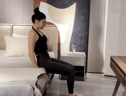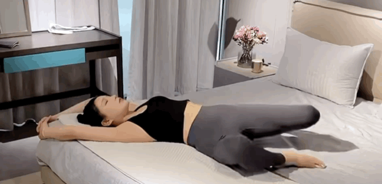Next, let’s tackle those wide hips with the waist wedge. Simply lie on your stomach with your waist against the edge of the bed, and lift one leg toward the ceiling before bending it forward. This move not only lifts the buttocks but also helps to correct leg shape for a more balanced look.