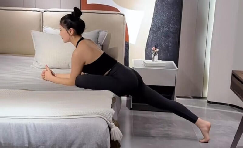But we’re not done yet! How about some foot placements? Place one foot on the bed and bend it outward, while the other foot goes backwards with the toes on the ground. This simple move helps to adjust the pelvis and improve blood circulation.