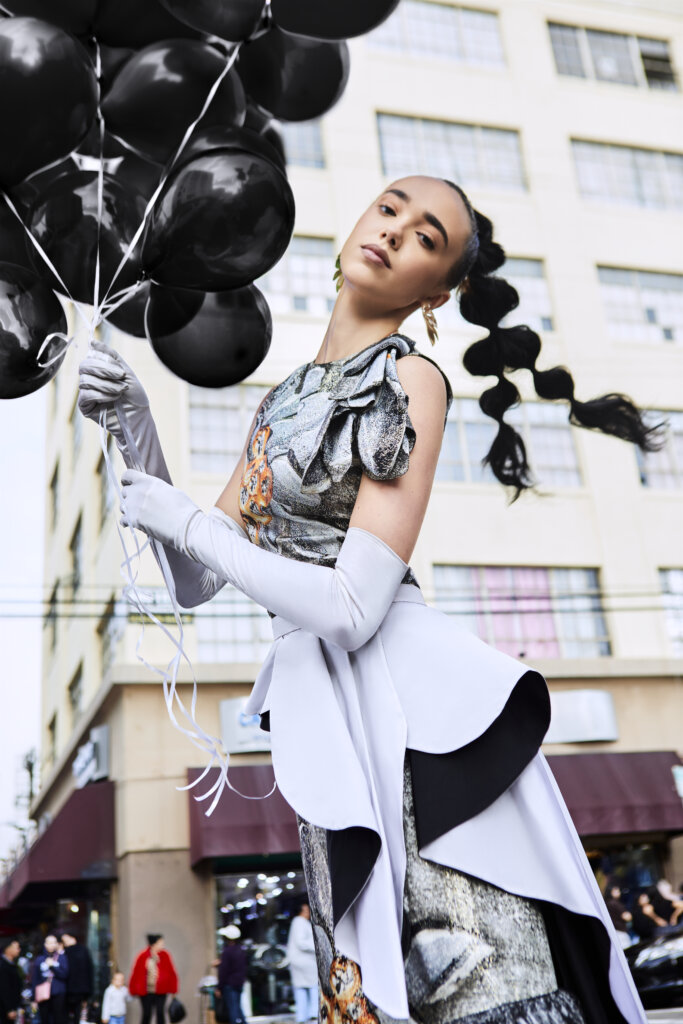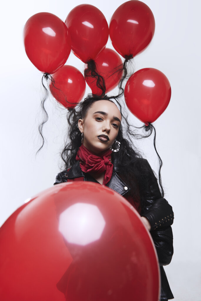 “Rebel Circus” is a visual feast that challenges conventional fashion norms by combining the audacious elements of clowncore with punk’s raw energy. Moving away from the typical dark, androgynous punk aesthetics, this series brightens the edgy pieces with a splash of bold colours and a hint of femininity. Stylist Phoenix Tiffany dispels the notion that adopting an edgier design necessitates sacrificing a cheerful and vibrant aura. The outfits achieve a harmonious balance between edgy and whimsical by skillfully pairing heavy jackets with softer, textured dresses. The addition of neon colours and circus-themed props like balloons injects a playful, carefree spirit into the series, inviting viewers to embrace their free-spirited side.