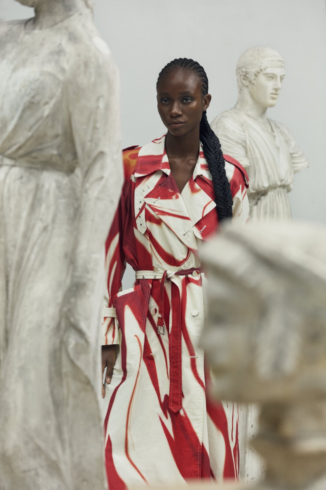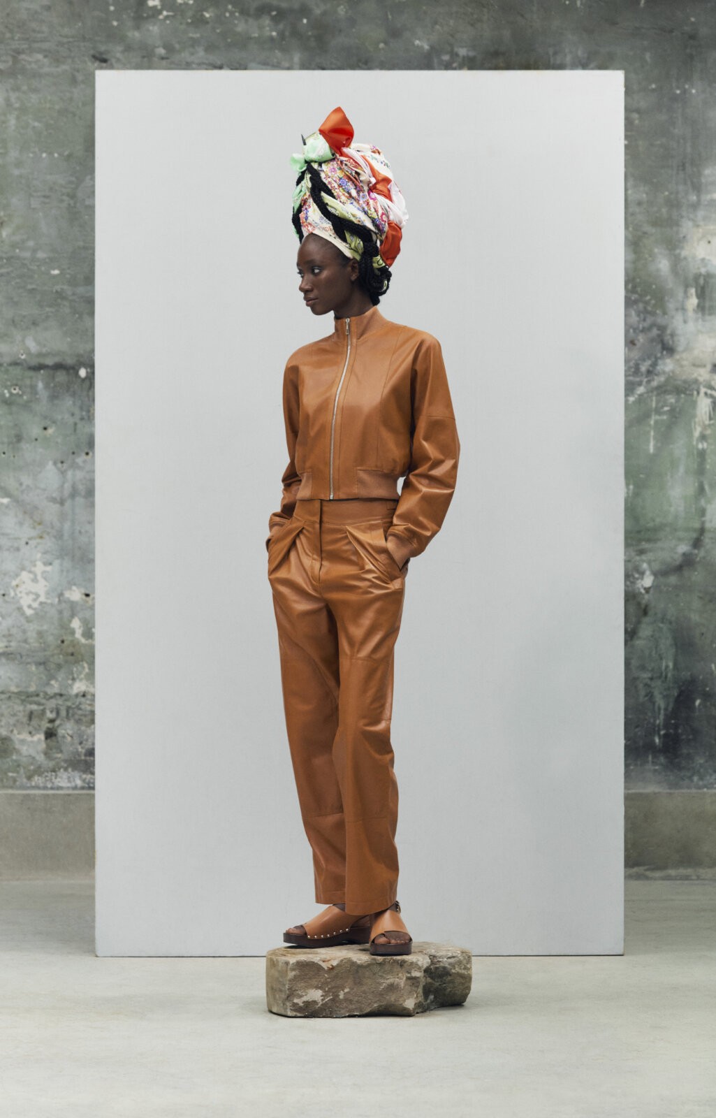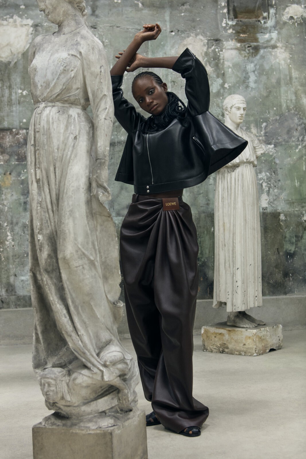 Nappa lambskin trapeze jacket and draped trousers, Loewe, sandals, Church’s.