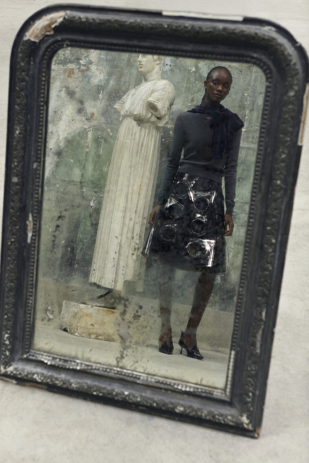 Like a living sculpture, she inspires herself, creating defining shapes in unexpected materials.