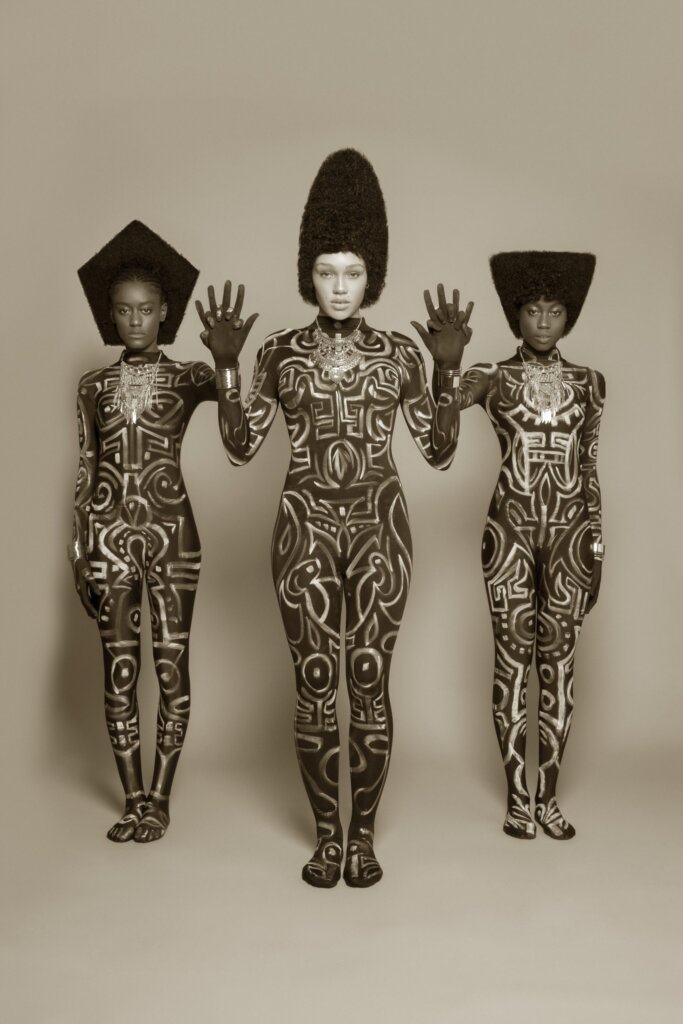 Beginning with a subtle makeover. Medinah and the makeup artist Julia painted on brown morphsuits using water-activated makeup that blended seamlessly with the models’ skin. The intention was to mimic the spiritual intensity of body art and to centre the physical form as a site of power.