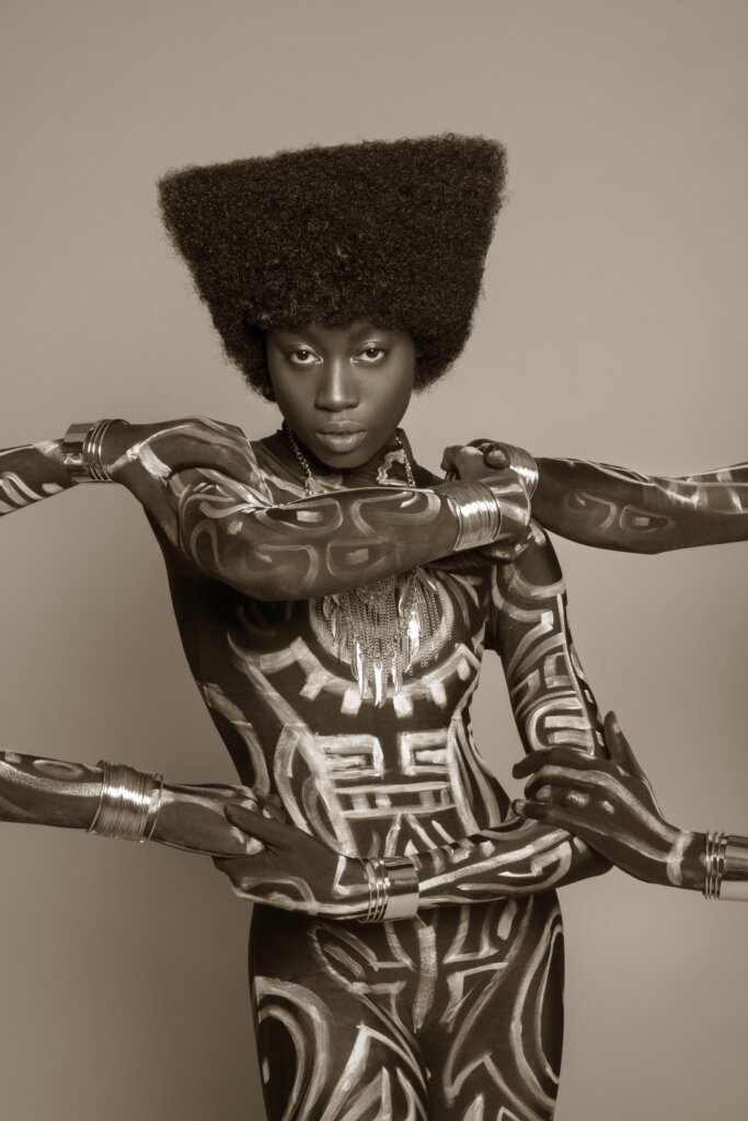 In the 1960s and 1970s, natural hair was a political act and afrocentric pride. So the hair — sharp, intentional, and unapologetically African — framed each woman’s presence and power. The waist beads of the original queens were replaced with boho vintage necklaces and silver bangles, juxtaposing the past with a touch of present-day minimalism.