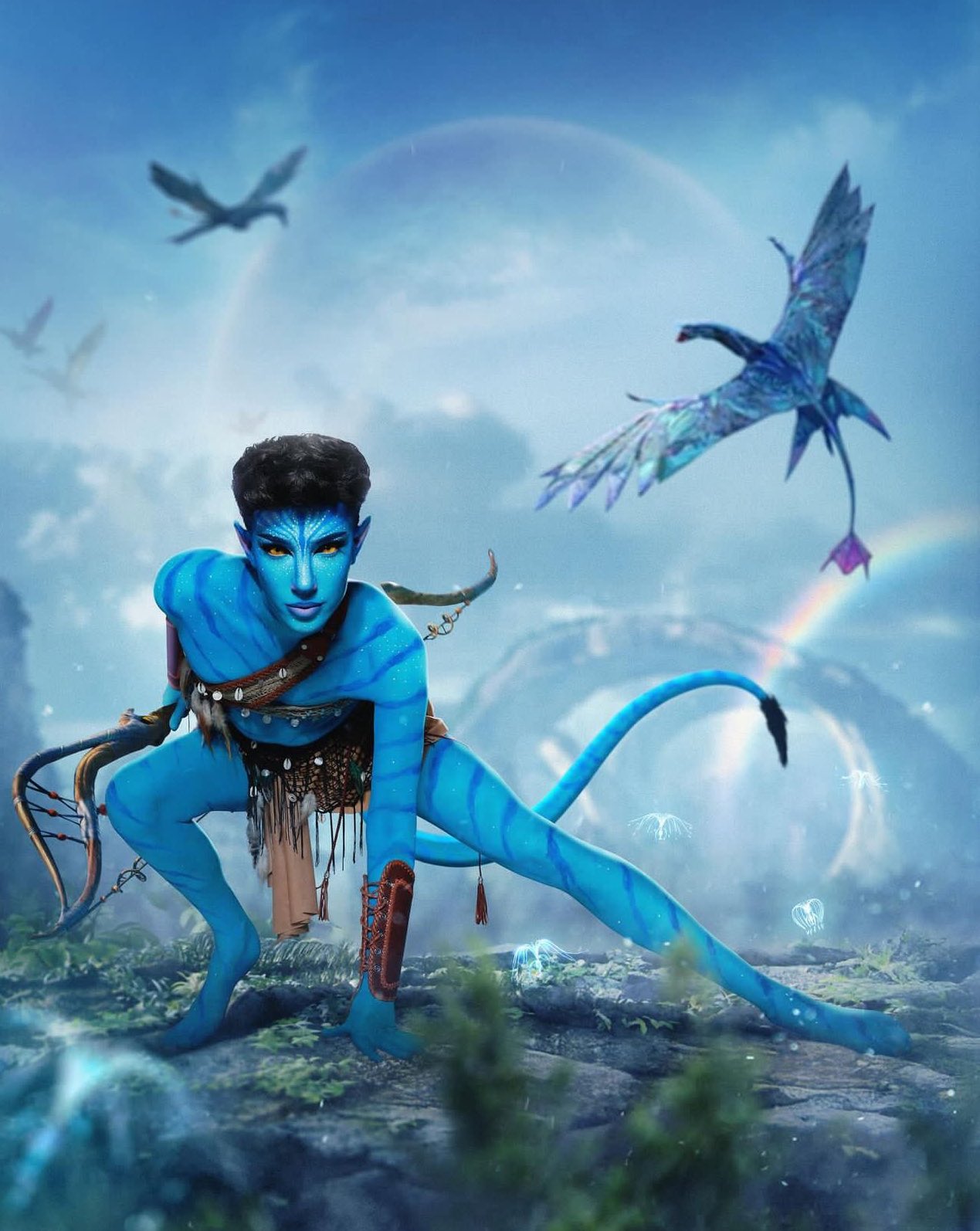 Charles’ costume, inspired by the Na’vi from the “Avatar” franchise, features the distinctive blue skin and intricate details characteristic of the Na’vi, including the braid-like appendages on the head and a tail, and the unique attire that blends with the alien environment depicted in the background captures the essence of the Na’vi’s connection to nature and their mythical appearance.