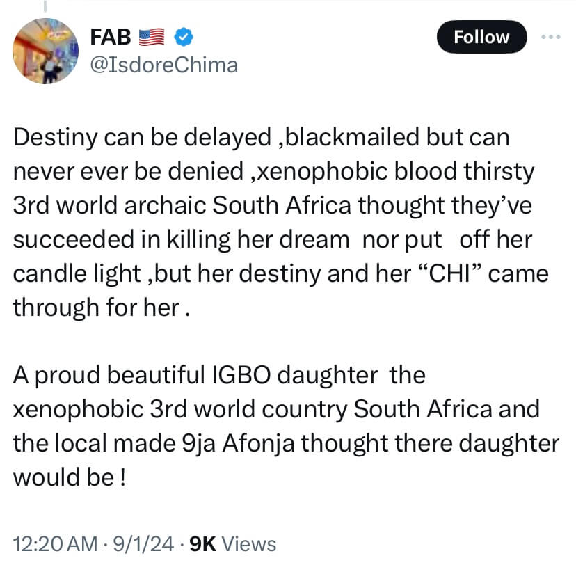 Amid the Adetshina controversy, Ufa Dania, a contender from Kwara State, garnered significant backing from South Africans on social media to spite Nigerians, with many voting for her. Several South Africans who had anticipated Dania’s victory, showed empathy towards her, labelling her the “true queen” in light of Adetshina’s triumph.