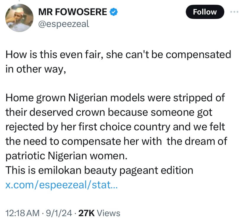 X user reaction to Adethina winning Miss Universe Nigeria, via X (formerly Twitter)