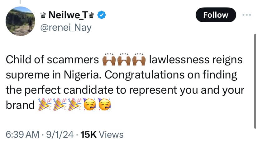 X user reaction to Adetshina winning Miss Universe Nigeria, via X (formerly Twitter)