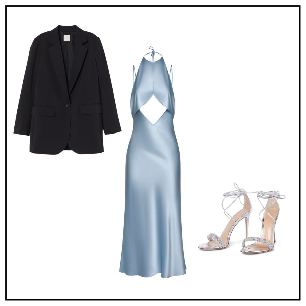 If minis aren’t your cup of tea, a well-tailored blazer on a silk dress and a pair of comfortable-heeled sandals will do the job perfectly.