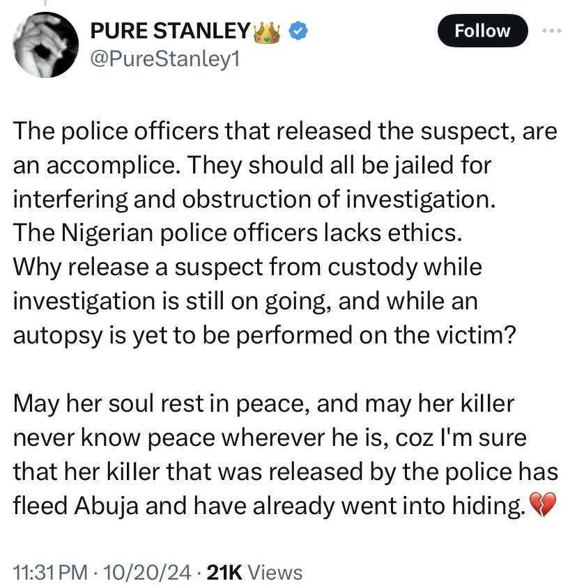 Nigerian activist Harrison Gwamnishu took to Twitter on Sunday, October 20, 2024, to seek justice after the tragic death of 24-year-old Priscilla Ocheme, who was allegedly killed by her boyfriend in Lugbe, Abuja.