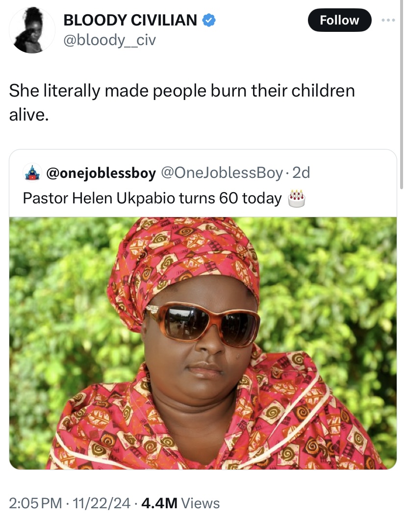 Bloody civilian’s tweet about Pastor Ukpabio, via X (formerly Twitter)