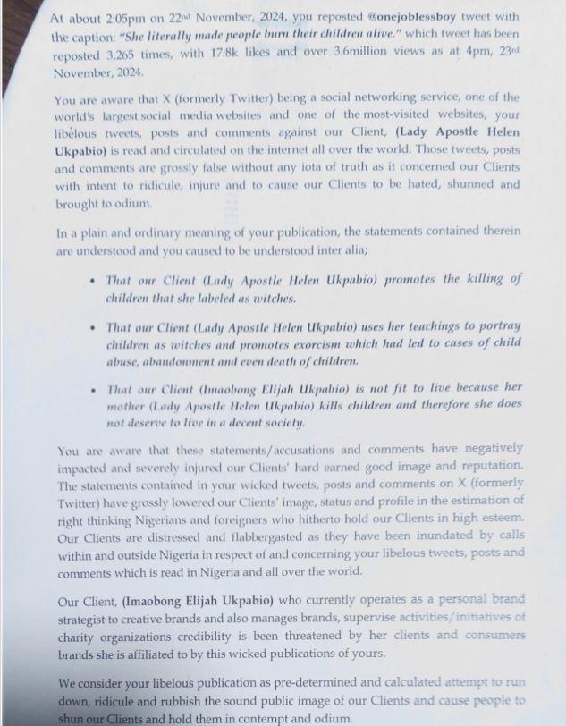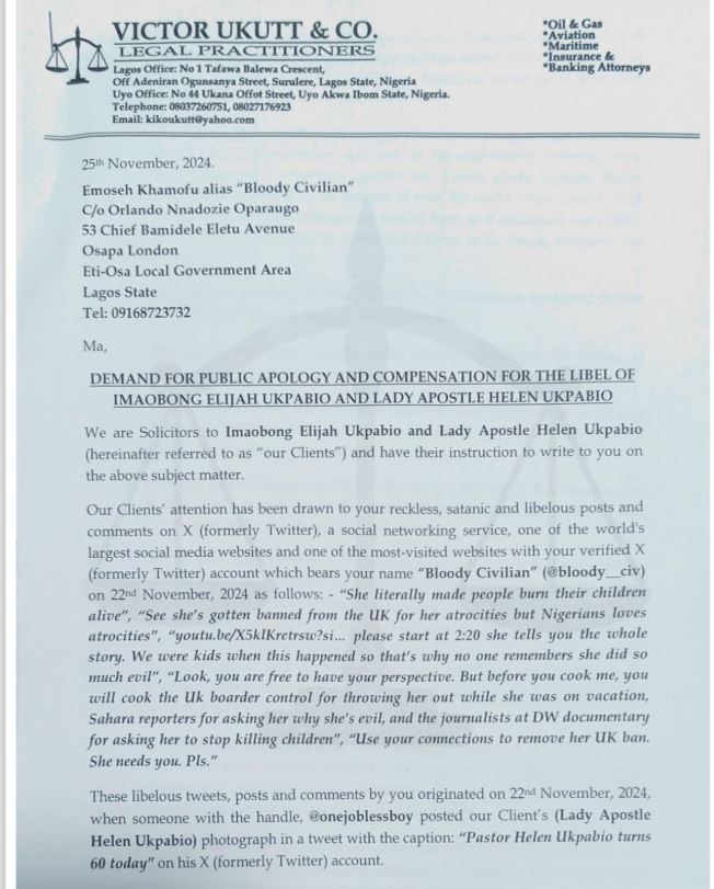 In the letter, the Akwa Ibom-born pastor, through her legal counsel—Victor Ukutt and Co. Legal Practitioners—issued the demand under the title, “Demand for Public Apology and Compensation for the Libel of Imaobong Elijah Ukpabio and Apostle Helen Ukpabio.”
