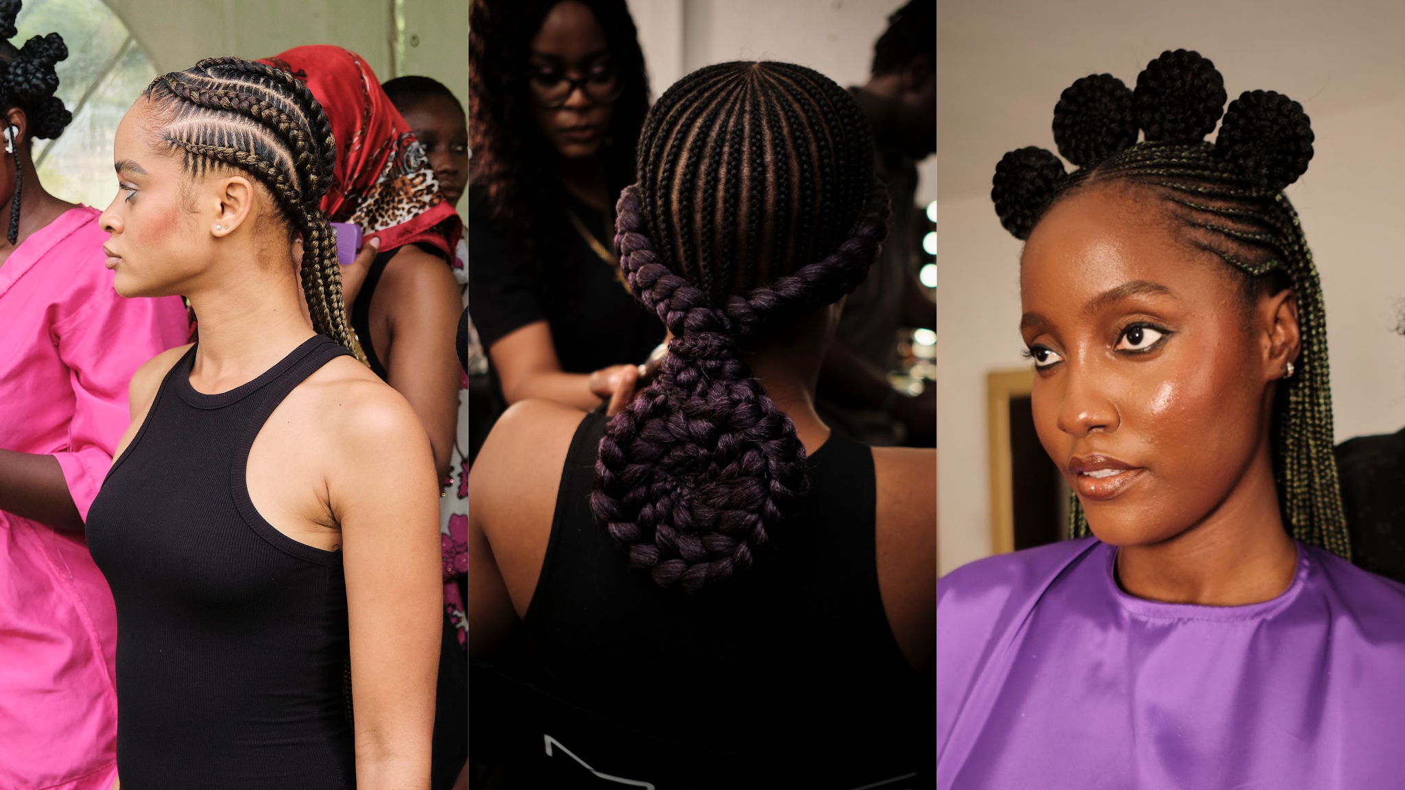 Popular hairstyles had a facelift, like pigtails affixed with curls and bantu knots surrounded by flat braids. To keep with the minimal and exotic vibe of our runway, there were a number of braided buns with Afro puffs around the head, adding an extra layer of pzazz to the styles.