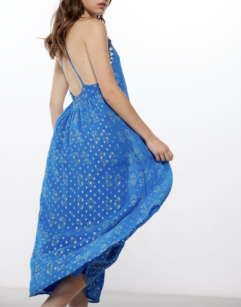 This dress from the new High Spirits collection stands out with its open-back design, electric blue colour, and metallic-toned print. It also has a length that falls slightly above the ankles.