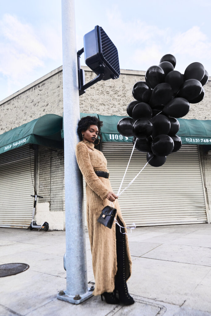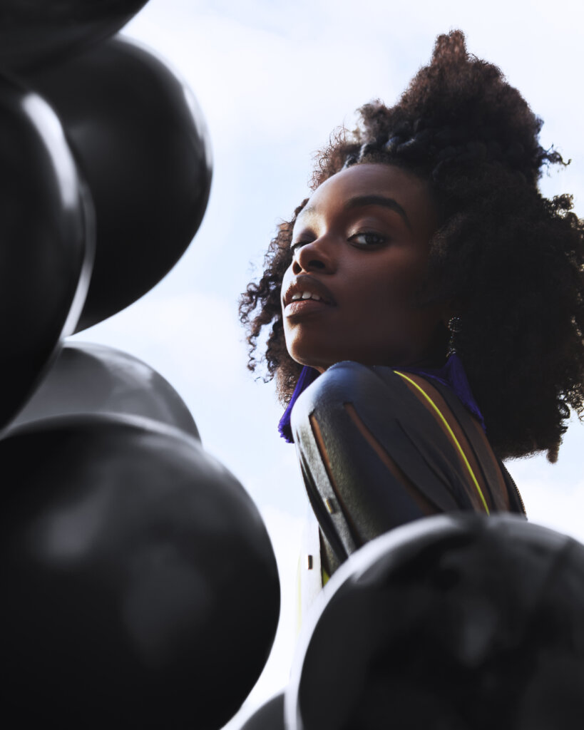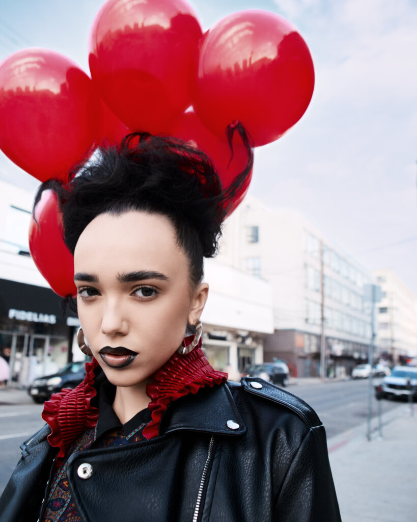 “Rebel Circus” is a visual feast that challenges conventional fashion norms by combining the audacious elements of clowncore with punk’s raw energy. Moving away from the typical dark, androgynous punk aesthetics, this series brightens the edgy pieces with a splash of bold colours and a hint of femininity. Stylist Phoenix Tiffany dispels the notion that adopting an edgier design necessitates sacrificing a cheerful and vibrant aura. The outfits achieve a harmonious balance between edgy and whimsical by skillfully pairing heavy jackets with softer, textured dresses. The addition of neon colours and circus-themed props like balloons injects a playful, carefree spirit into the series, inviting viewers to embrace their free-spirited side.