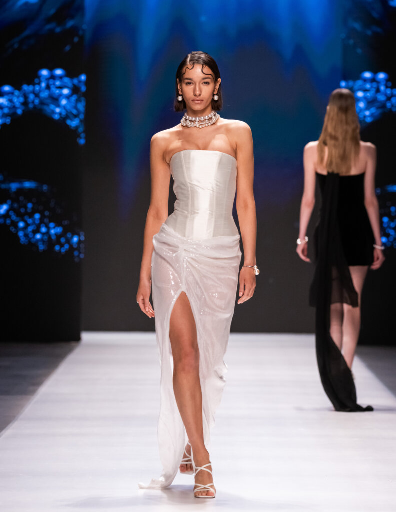 Graphic and shimmery eye makeup created mesmerising illusions in SOLANGEL and Lutani. Enhancing the runway designs with celestial allure, Timshee adapted a matte winged finish. From minimal but graphic lines of IANIS CHAMALIDY to frosty accents of EFREMOV, eyes became the focal point of beauty.