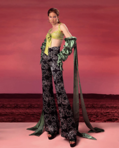 These pieces go together perfectly but feel free to deconstruct and style each separately. Expect silky and flowy fabric that feels great on the skin; the pants have this beautiful detailing that will go perfectly with crop tees, while the Moreni Puff gloves are the perfect addition of drama to any simple outfit.