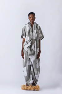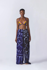On the cover, two of the four brands featured take centre stage. Ayodele Olofintuade exclusively wears white and occasionally grey for spiritual reasons, making the grey shawl Kaftan from Eki Kere a perfect choice. Dolapo Osunsina looked every inch like an Orange Culture model with her Lola Wave Waist pants, Ally’s bra top, and Moreni puff gloves. Finally, to capture Alexandra’s essence, we selected the raffia jacket and Iban pants from Eki Kere.