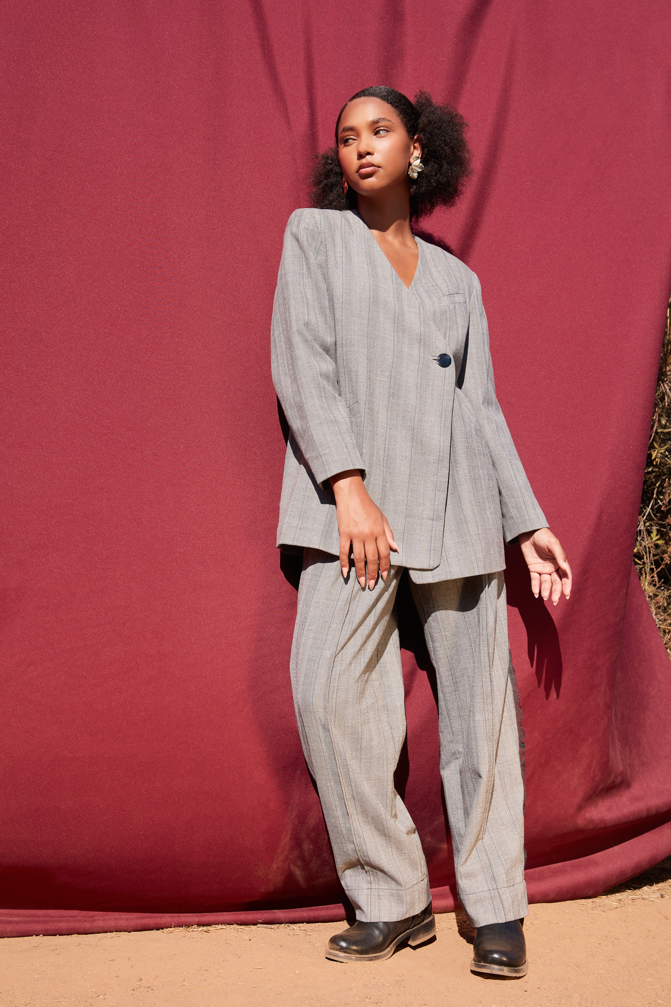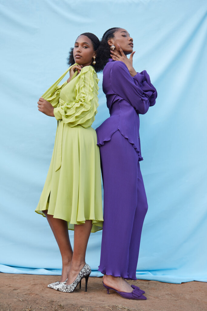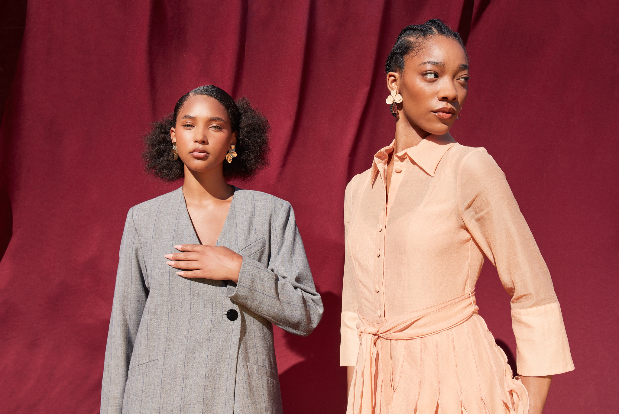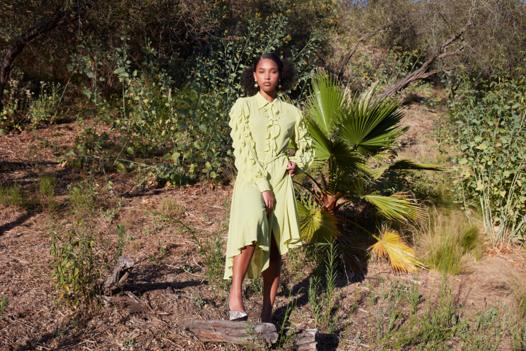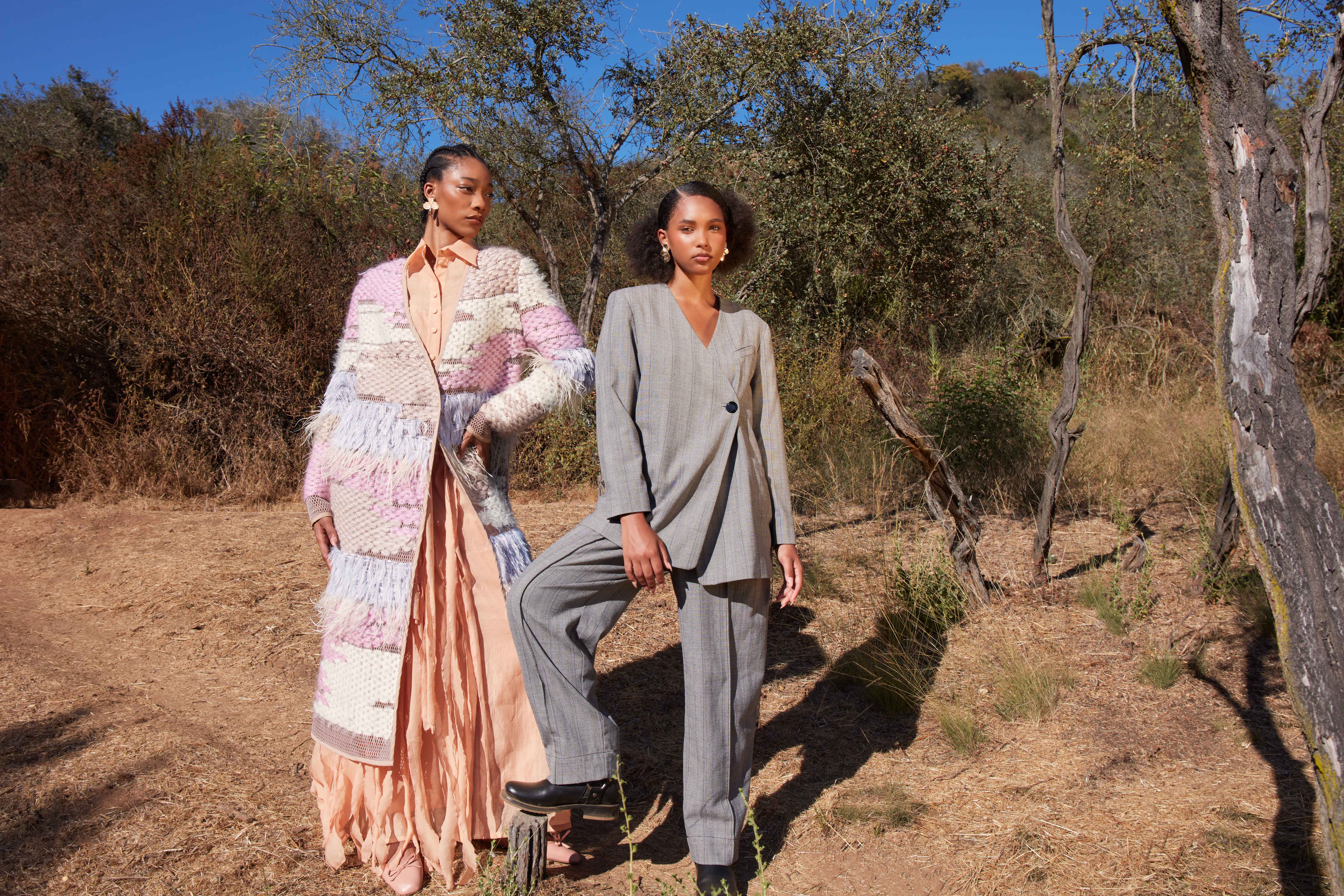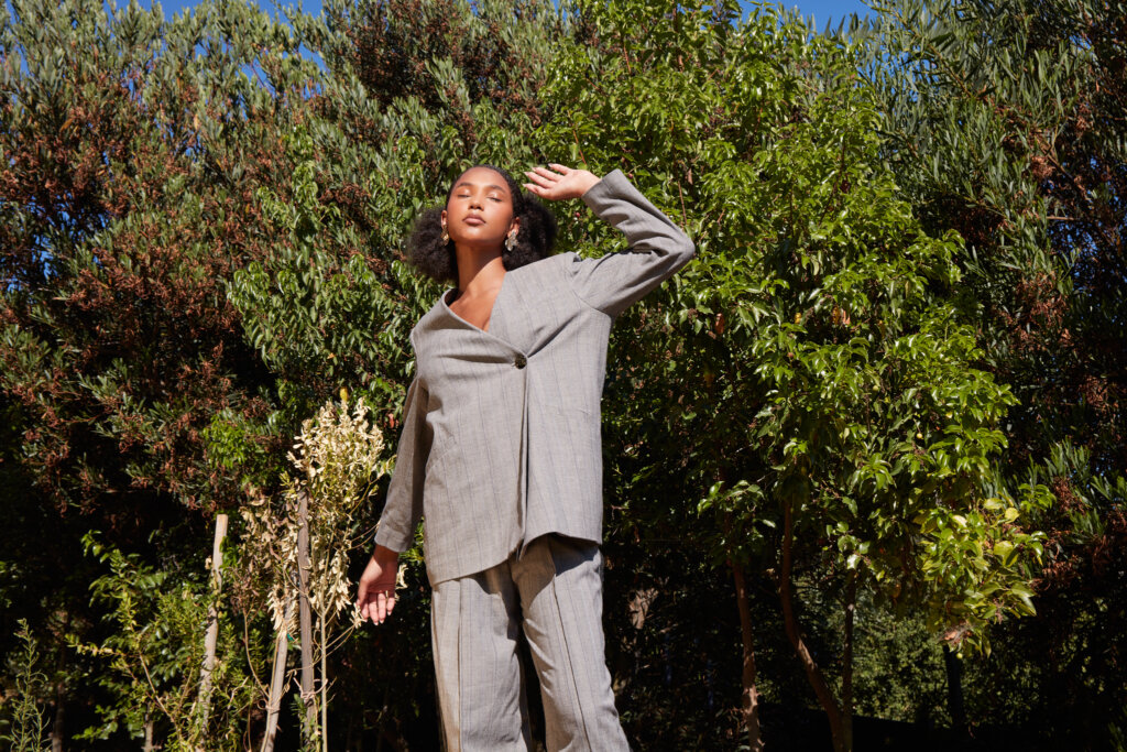 The styling, meticulously curated by Bridget Dickey. Featured outfits that complemented the models’ free-spirited energy. From the sleek grey Ganni herringbone suit, Jaela wore to the bold Rejina Pyo printed Dylan dress on Deasj. Every piece was a nod to understated elegance. Accessories from Ferezzi added a touch of luxe to the looks, with statement earrings that tied everything together seamlessly.