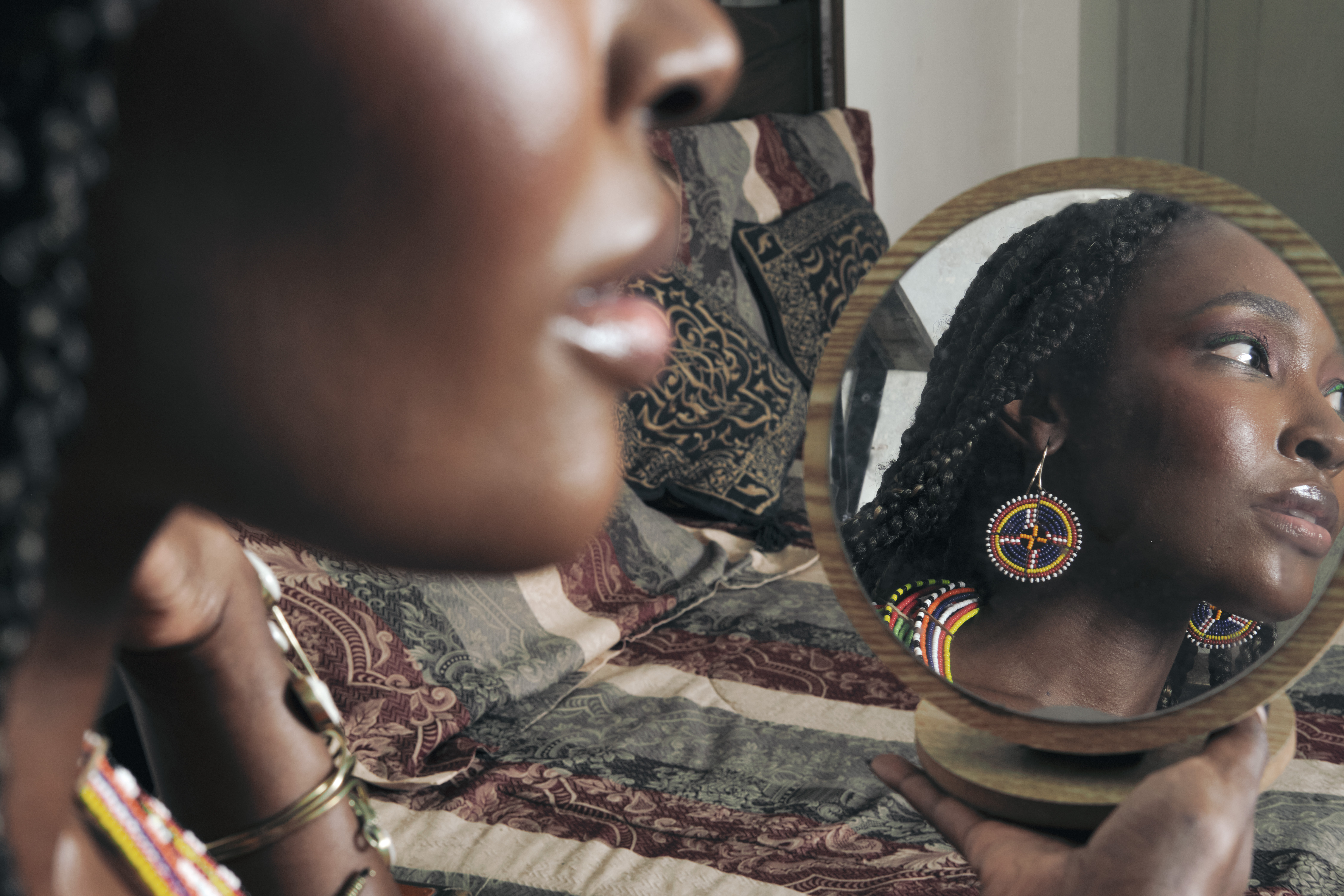 Dolapo wearing Maasai beadwork necklace and earrings from their personal jewellery collection