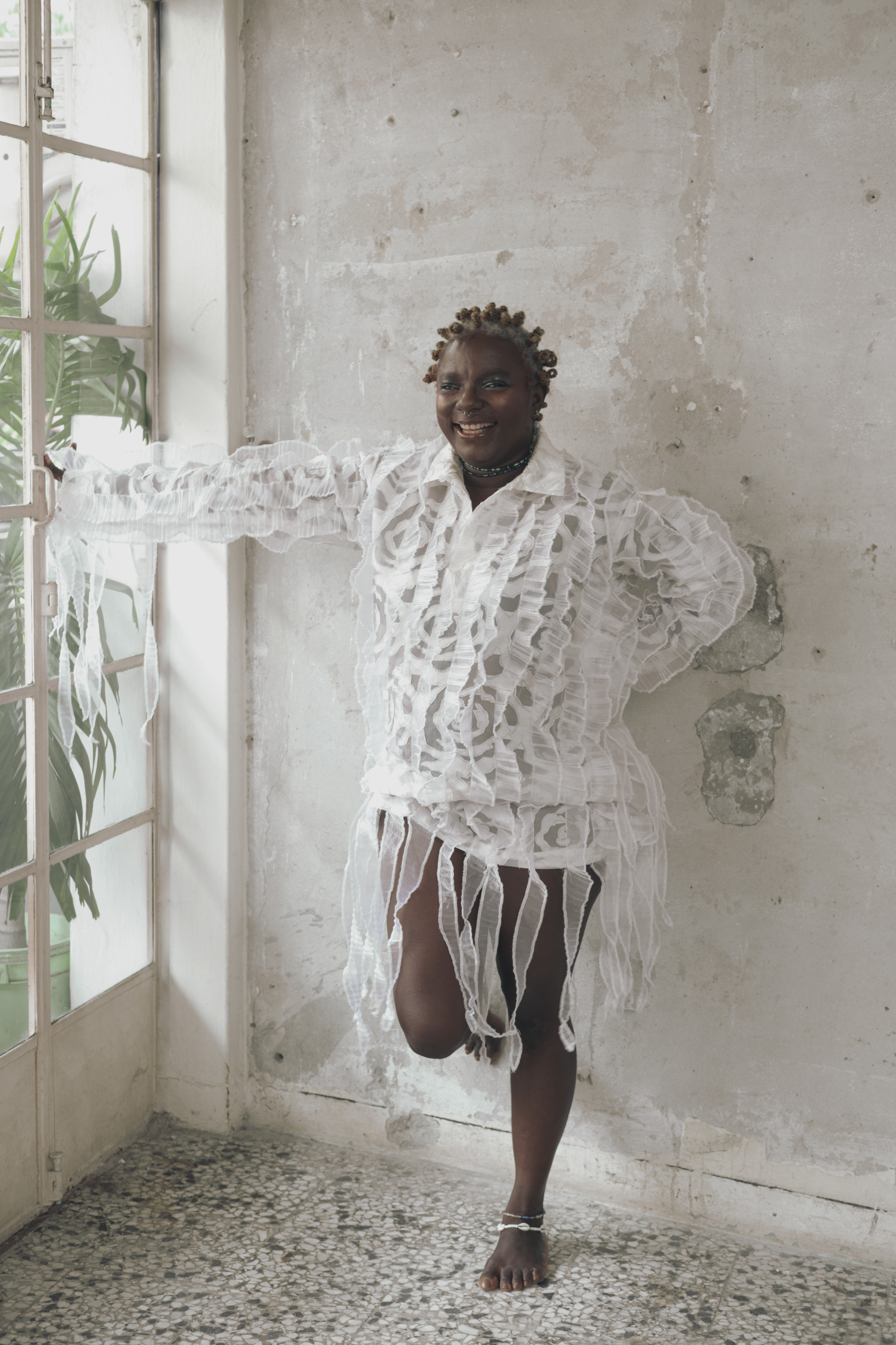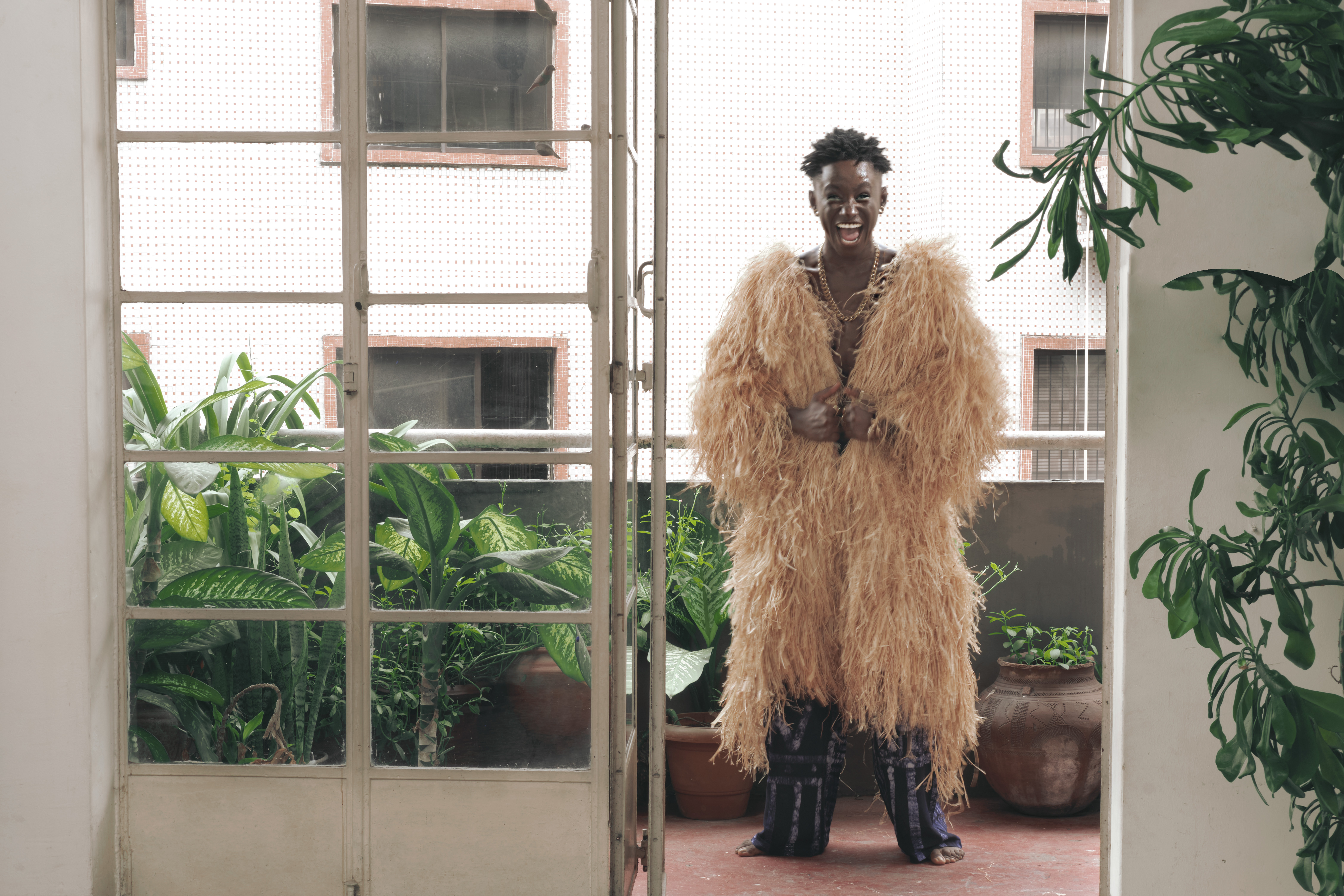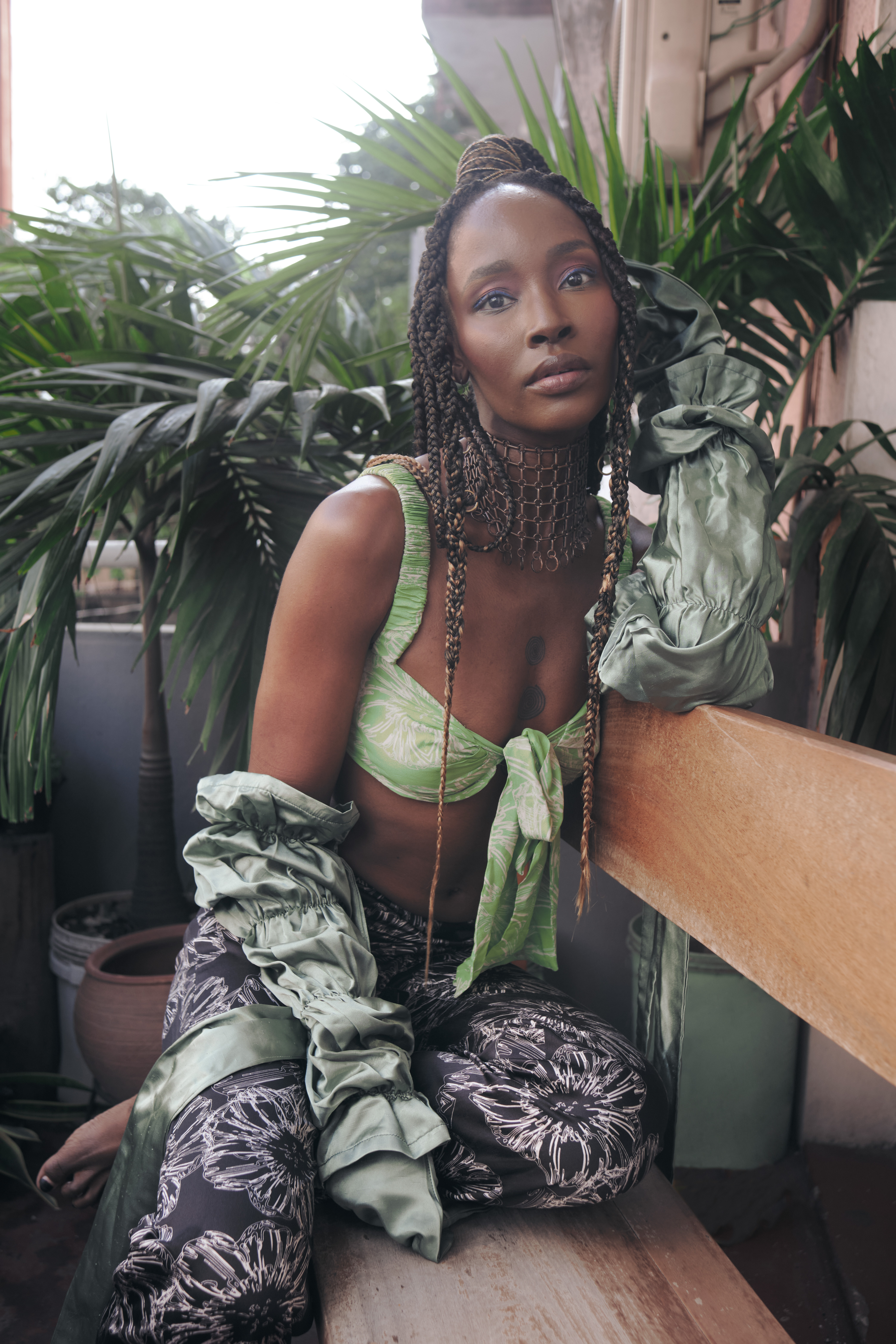 Alexandra wearing the Raffia jacket and Iban pants from Eki Kere and jewellery from his personal collection