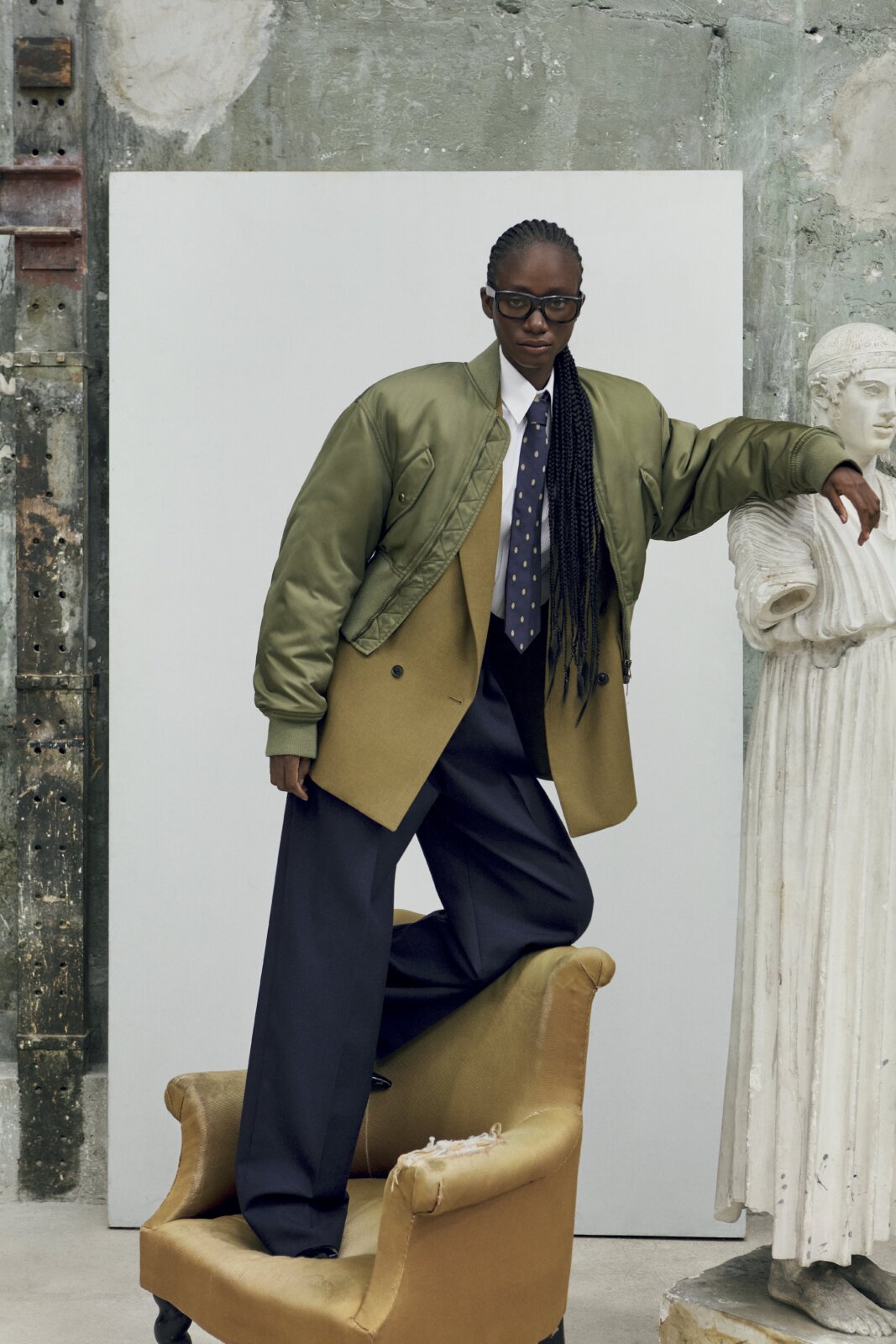 Nylon bomber jacket, wool canvas trouser suit, cotton poplin shirt, glasses, tie, belt, slingbacks, all Saint Laurent by Anthony Vaccarello.
