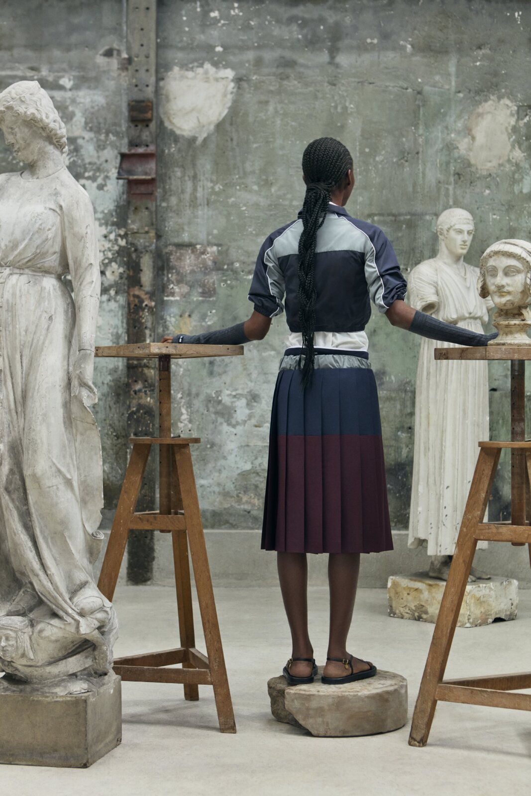 Two-tone silk blend jacket, poplin shirt, silk blend briefs, kid mohair skirt, Miu Miu, sandals, Tod’s.