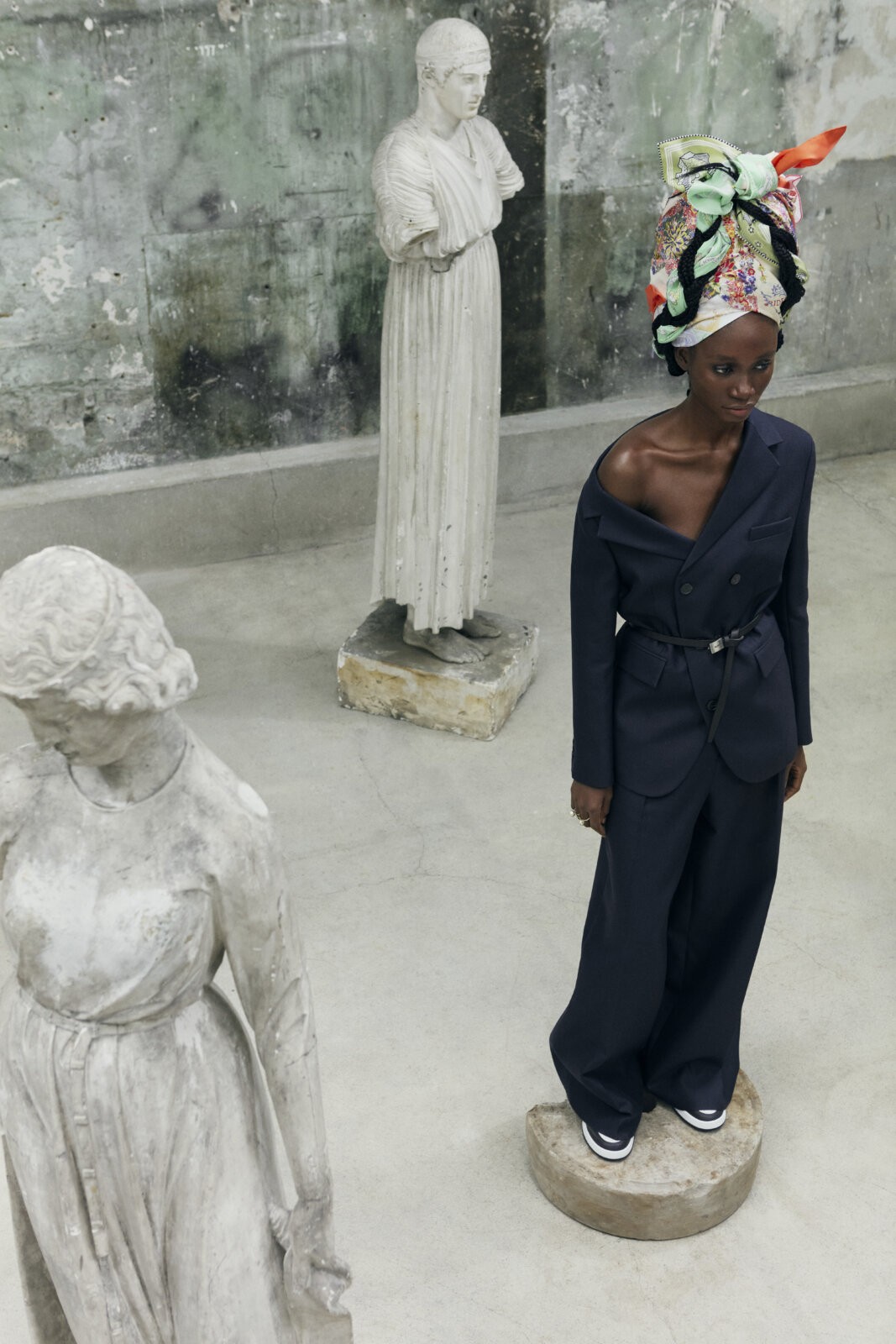 Silk and virgin wool asymmetric jacket and pants, sneakers, Christian Dior, silk twill scarves Hermès, belt Max Mara.