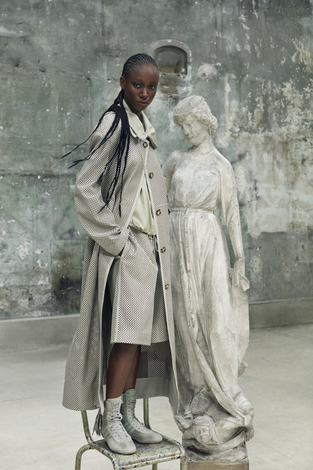 Alter Mat perforated coat and long shorts, organic cotton top, all Stella McCartney, vegan sneakers, Stella McCartney x Adidas.