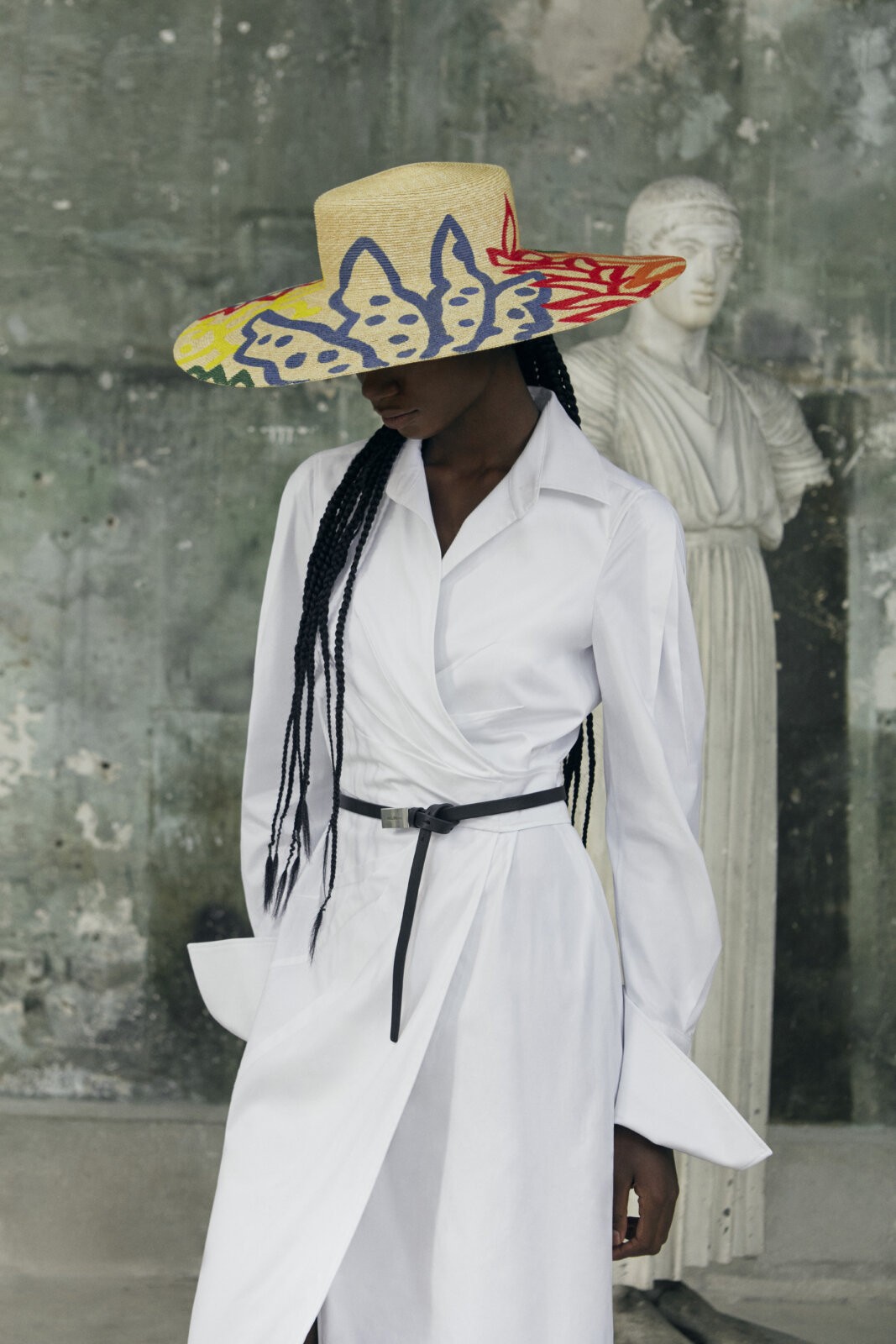 Cotton draped shirt-dress, belt, Max Mara, hand-painted straw hat, Hermès.