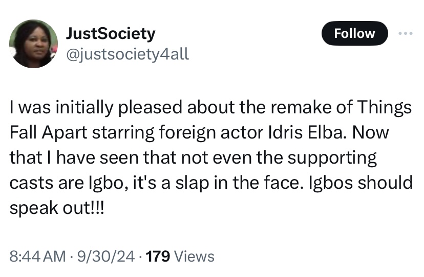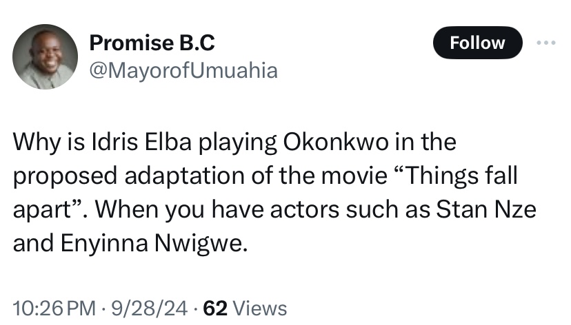 However, concerns about authenticity and cultural appropriation linger. Foreign casts and crews keep struggling to represent Nigerian culture, potentially perpetuating stereotypes or misrepresentations accurately. To reiterate, Idris Elba is not Igbo or Nigerian and is known for his rich British accent. Both qualities already beg the question, What authenticity can he bring to “Okonkwo?”